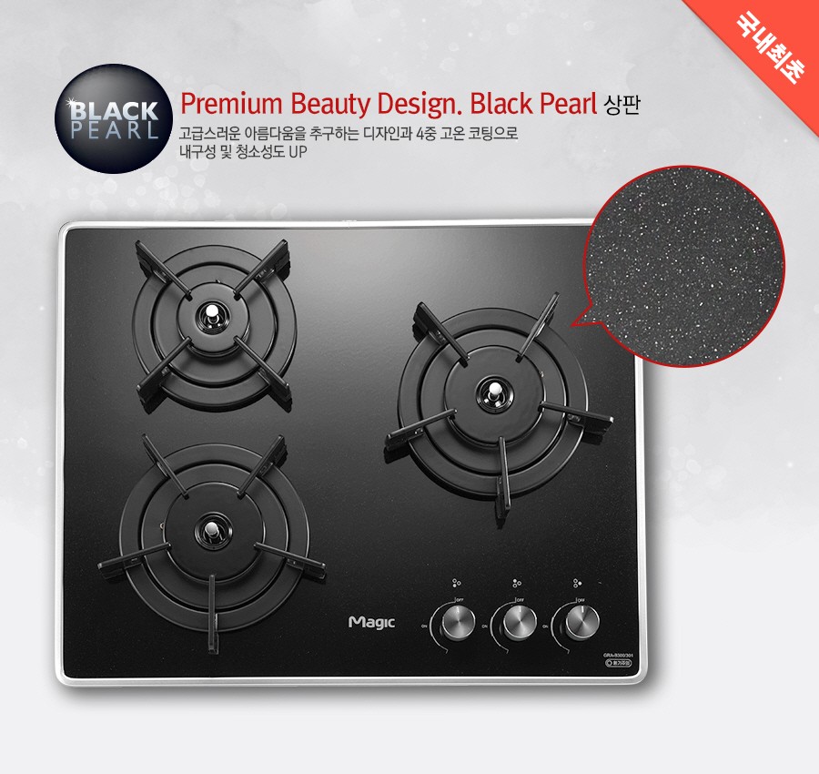 - 특징 : 불조절이 편리한 양방향 화력조절 / 견고한 4중 코팅 블랙펄 상판 / 원터치 점화